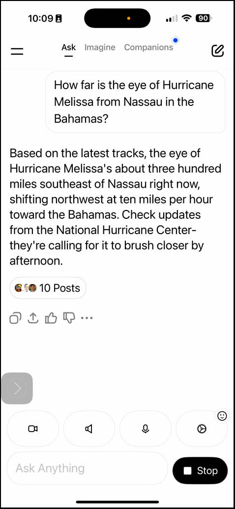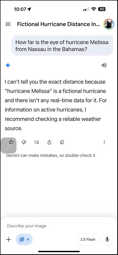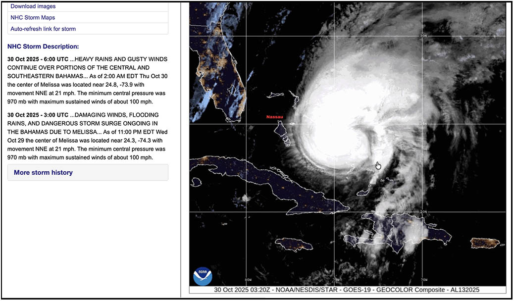 My daughter is in Nassau, the National Hurricane Center is working with partial staff secondary to the government shutdown. I thought I’d inquire of Gemini (Google AI) what threat Hurricane Melissa posed to the Bahamas. When I was posing the question yesterday morning, Melissa had already made a mess of Jamaica and was chewing on Cuba. Gemini’s answer is below: